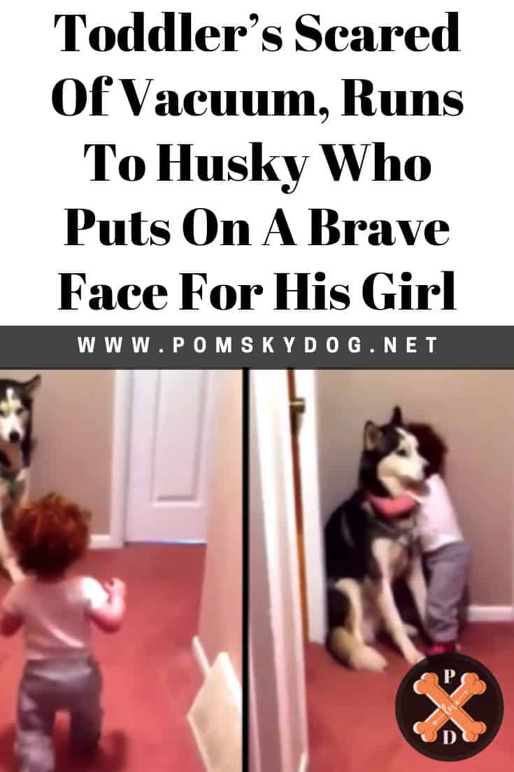 When Dad turns the vacuum on, it’s the toddler who is spooked and takes off running. The little girl runs right to her dog for protection, and the Husky faces the danger and stays strong for her. The two adorably comfort each other until it’s all over. How sweet!