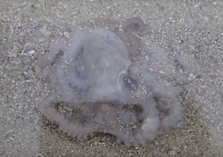 The octopus stayed there for several seconds, rested its tentacles on the man’s foot, then pushed itself away and glided across the sand.