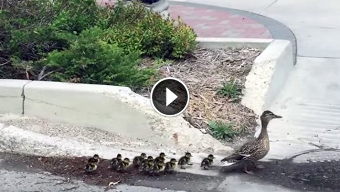 Human activity can endanger the babies: pedestrians and motorists who don’t see them in their way can trample them, if the family finds itself on the road, much like the way this one did. The mama duck and her 12 little ones faced a potentially perilous journey to the nearby South Saskatchewan River.