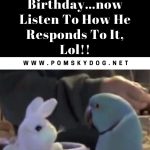 Marnie approaches the new toy and begins to talk to it. “Hello,” he says to his new friend. “Pretty.” The beautiful bird examines the bunny and asks, “What ya doin’?” and then, with a little encouragement from his humans, says “Give a kiss!” He precedes to kiss the bunny and immediately tells it, “Thank you!”