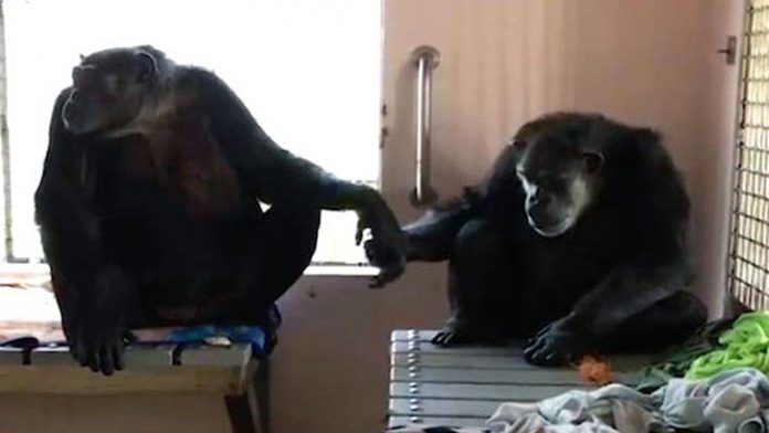 A sweet moment between two new friends will make your heart melt. Hand in hand, two chimpanzees who were recently introduced don’t seem to want to let go of each other despite having very different backgrounds.