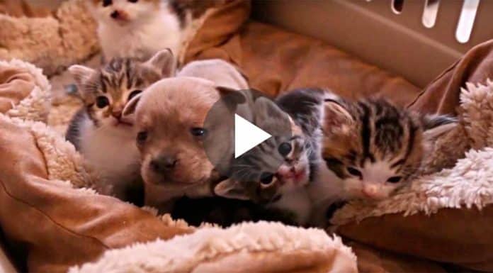 I’d like to briefly talk about why we adore seeing puppies raised by cats and vice versa. In the video below you can see a light brown puppy amongst a litter of kittens being raised by a tabby cat. The puppy was just a couple of days old when his mother was killed by a car. It happened in Detroit.
